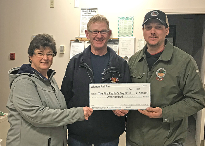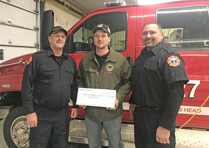 Kim Rydall, Vice President (left) and Ezra Mast, President (right) of the Wiarton & District Agricultural Society, present Brad Ironmonger (centre)from the Wiarton Firefighters Association with a $100 donation for their Christmas Toy Drive.
