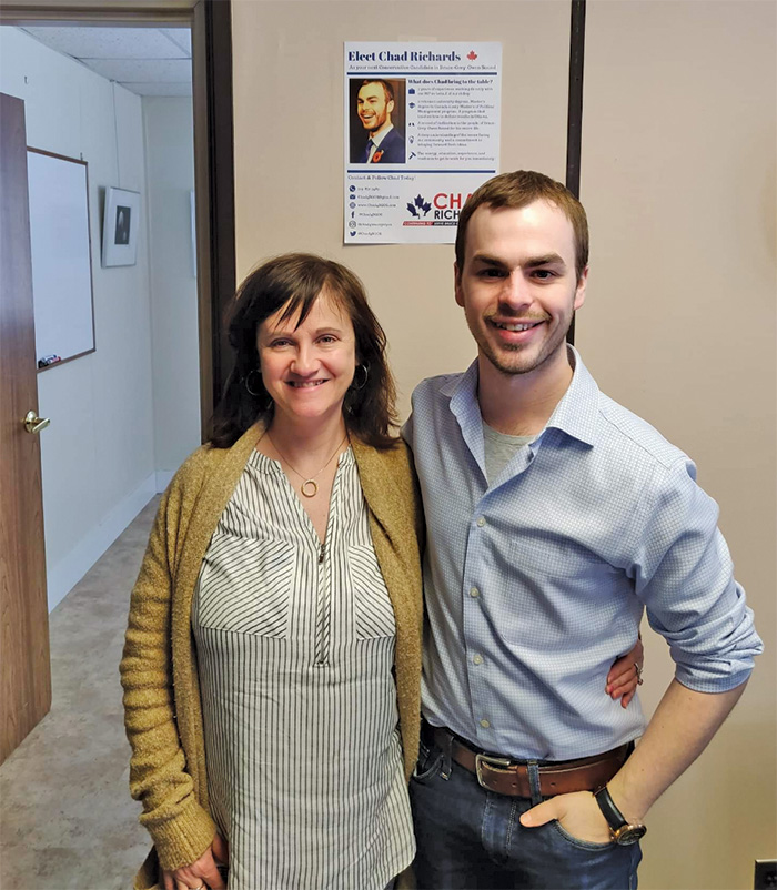 Uncategorized Bruce-Grey-Owen Sound Conservative Nomination Candidate Chad Richards Visits Tobermory April 3, 2019 1705 Share FacebookTwitterWhatsAppLinkedinEmailPrint Kim Davis (left), whose family was among the first families to settle in Tobermory, poses with Conservative nomination candidate for Bruce-Grey-Owen Sound, Chad Richards (right), at the March 24th Meet & Greet held at the Meeting Place in Tobermory.