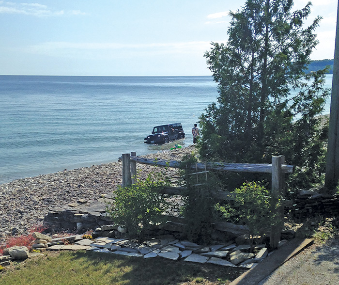 Imagine Sunday morning (today) we are having coffee on our porch trying to enjoy the water, humming birds and loons being drowned out by very loud music from the Air B & B next door, only to see them driving their Jeep in our beautiful, pristine Georgian Bay.
