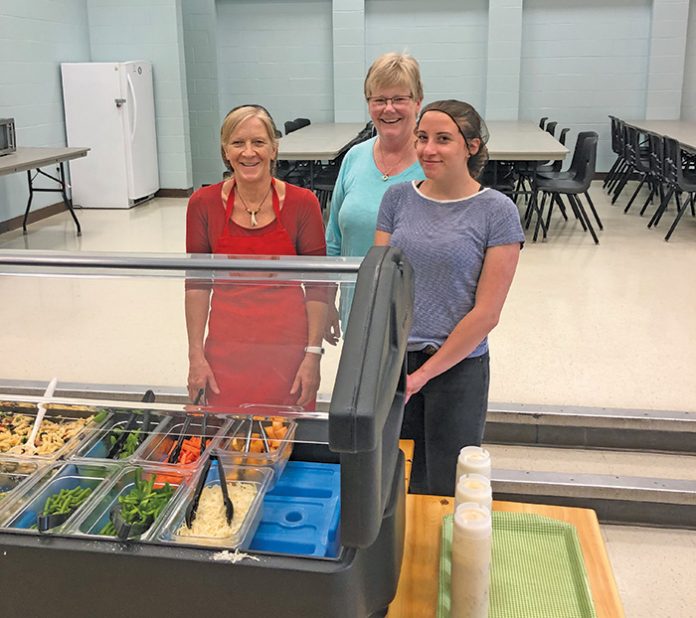 L-R: Ms Marian Beninger, Trustee/volunteer Jane Thomson and co-op student Michelle Davies Straby pose on another successful salad bar Wednesday. Local donors have provided 3 months of support to keep the salad bar free for all students.