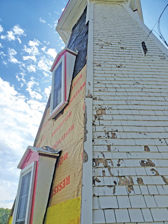 The north-east side is the worst. The old shakes and tarpaper have been removed. We have installed ice and water-shield and replaced about half of the shakes so far. All the corner boards will have to replaced too. With winter coming on we have had to stop work on scraping the remaining five sides. They have been left “as is “.