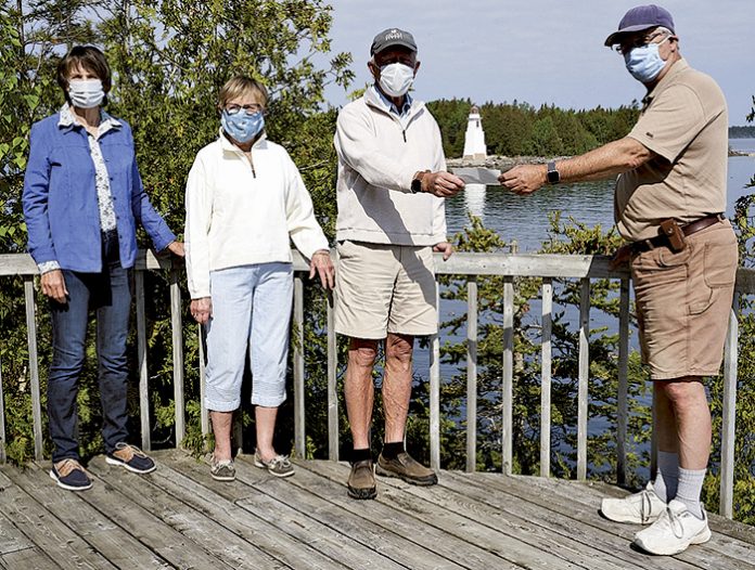 Members of the Tobermory Yacht Club Bernadette Burton (Secretary) Carol Herman (Commodore) and Lawrence Beagan (Treasurer) presented a cheque for $1,000 to the Friends of Bruce District Parks, represented by Bill Caulfeild-Browne, towards the restoration of Big Tub Light.