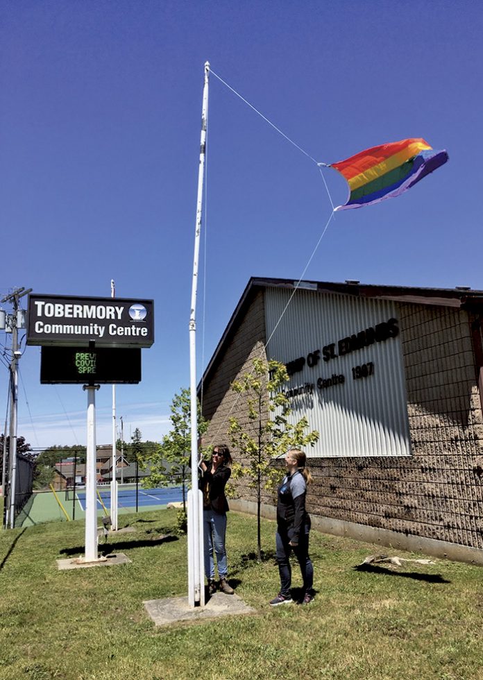 On Friday, June 12th the Municipality of Northern Bruce Peninsula held a flag raising ceremony in celebration of Pride month. The flag raising ceremony, which was streamed online to encourage social distancing, took place at the Tobermory Community Centre with Councillor Megan Myles (left) and CAO Peggy Van Mierlo-West (right) raising the flag.