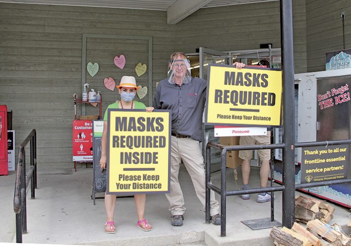 Tobermory Chamber of Commerce President Neda Sarbakhsh (left) delivered MASKS REQUIRED signage to Rick Peacock (right) just in time for the July 11-12 weekend. Peacocks required masks proactively before it was mandatory; Rick is happy with that choice but says “it’s getting ‘way better now that masks are required everywhere”.