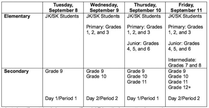 The attached chart (below) outlines the days that students will be attending school during the week of September 8, 2020. For example, the first day of school for JK/SK and Grade 9 students will be September 8, Primary and Grade 10 students will begin on September 9, and so on.