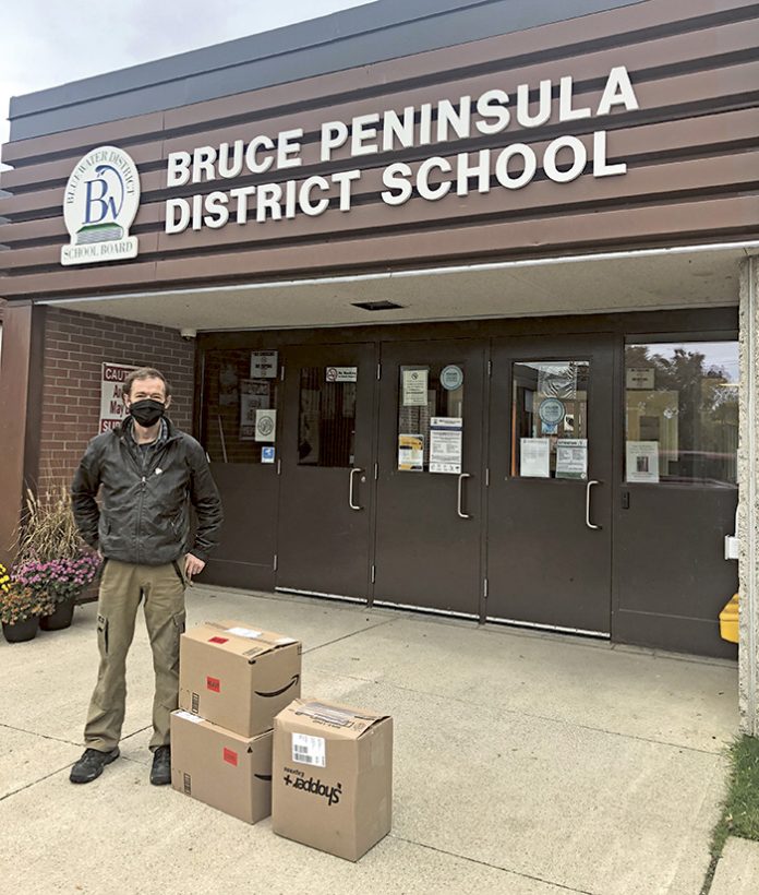 Photo: Thanks to Tim Hayes (shown) and the Community Bottle fund, we have a very generous amount of school supplies to allow each student to have their own bin supplies to be COVID 19 safe. Thanks to all for your support. Photo Credit: Matthew Pickett,