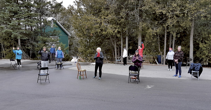 Photo: A good-sized group came out for yoga at the Tobermory United Church parking lot on December 10. Yogi Joann Schaner (at rear, third from left) took them through an hour of sitting and standing yoga, with participants steadily shedding layers as the time progressed.