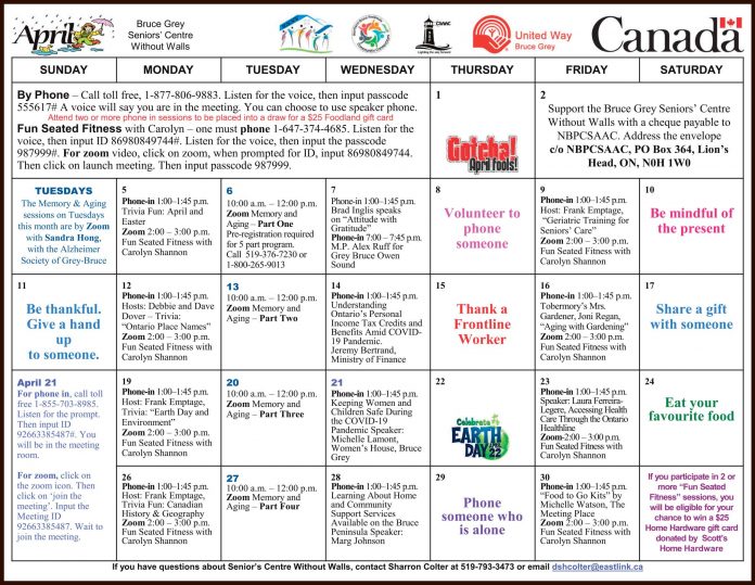 Phone in, toll free, dial 1-877-806-9883. Listen for the prompt. Input the passcode 555617# on Mondays, Wednesdays and Fridays at 1:00 p.m. to 1:45 p.m. to play trivia or listen to a speaker as printed on the April calendar. If you do not have e-mail, send me your address for the monthly BGSCWW calendar and poster to be sent to you. Contact Sharron Colter at 519-793-3473, dshcolter@eastlink.ca or PO Box 364 Lion’s Head ON N0H 1W0.