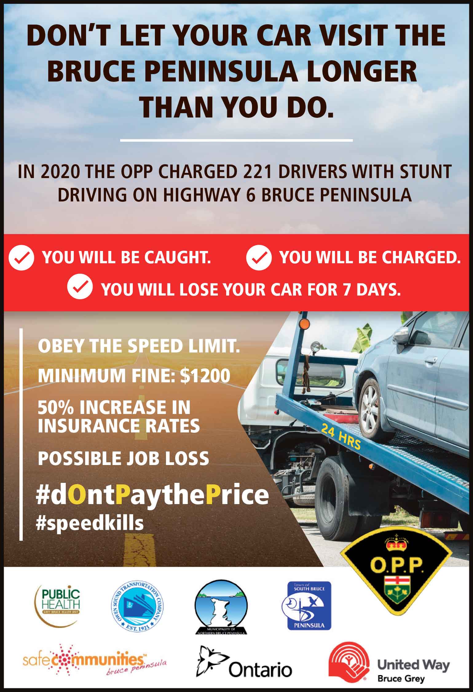 Funding for the campaign has been provided by the Ministry of Transportation and matched by donors and partners. Creative support has been provided by Avenue A who created the Bruce Peninsula Safe Communities’ Stunt Driving counting signs that kept a running tally of charges laid on highway 6 in 2020.