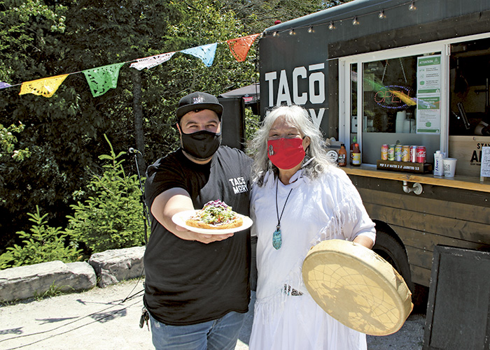 Photo: Celebrating National Indigenous People’s Day on June 21, Priscilla Tobey (right) joined Marty Oblack of Tacomory (left) to offer tacos made with traditional PowWow frybread. Tacomory made the “fixins”; Priscilla made the frybread according to a traditional recipe.