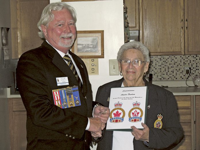 Congratulations to Amelia Dunham, who is a long standing member of both the Legion and the Ladies Auxiliary, on being presented her 40 year membership pin. Membership Chairman Rick Lane made the presentation to Amelia (Covid style) but there is a nice photo of the occasion.