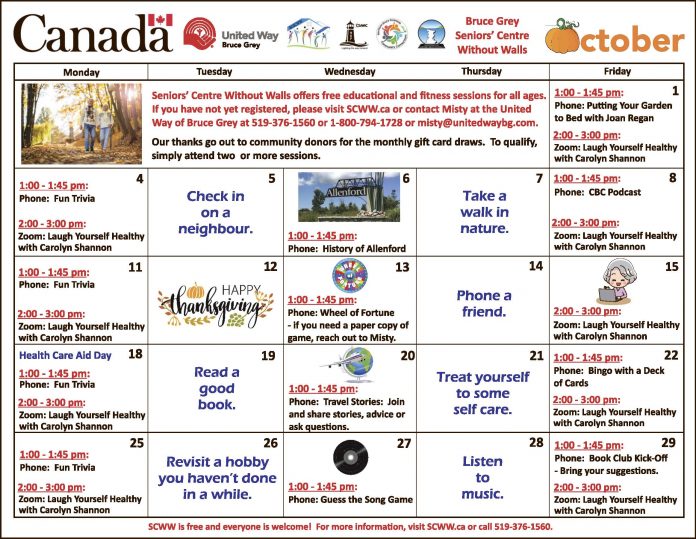 Are you a senior isolated and feeling disconnected from the outside world during the Covid-19 pandemic? The United Way of Bruce Grey, Northern Bruce Peninsula Community Support Committee and partners offer Seniors’ Centre Without Walls (SCWW). This telephone conferencing program offers an inclusive, safe, inviting space to listen, learn and be heard. It can also increase social connectedness and well-being of participants.