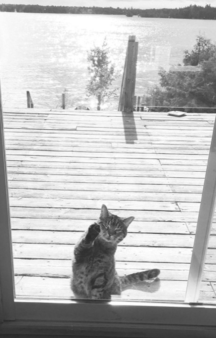 As an outdoor cat in Tobermory, tentatively let out with a strict curfew. Home by 8:30, sometimes stretching it later when the sun stayed high until 9:30 pm. Sometimes showing up early, squeegeeing the door, and having a snack. Then resigned to be in for the night, until morning. We had heard stories of fishers showing up on people’s decks, and were vigilant about ensuring he was home every evening.