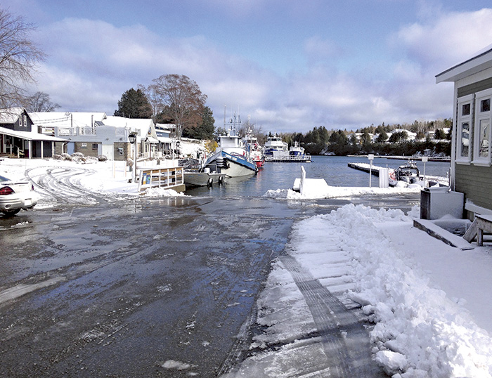 The solution in downtown Tobermory is obvious — lines painted on the road, a checkerboard sign and a gate across the boat launch at night.