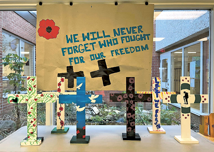 We have had lots of Remembrance Day art decorating our hallways and reminding us of its important. Grade 9/10 Tech students made wooden crosses, and Grade 11/12 Art students painted them, and made the banner (see photo above).
