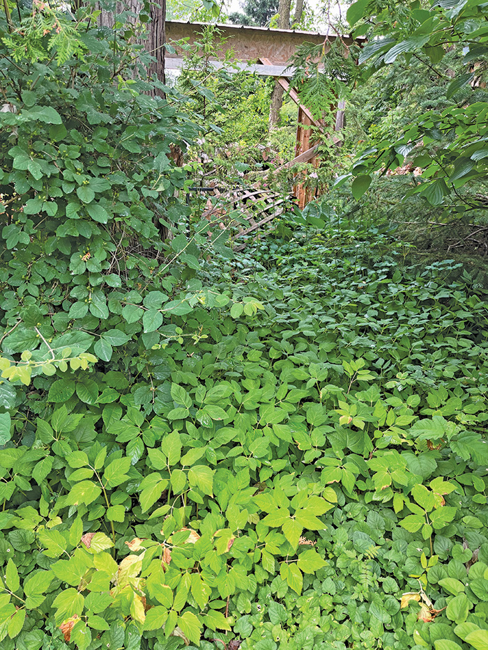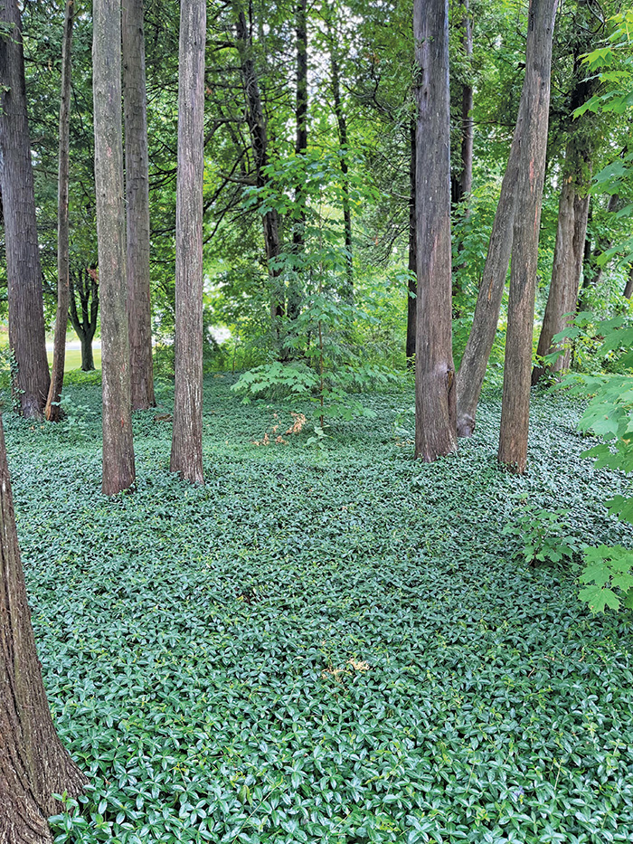 Perhaps no property in town was impacted more by this invader than my parents’ Lionheart BnB property on Main Street. While it still has two huge American Elms and a stately Sugar Maple, until recently, the woodlot portion of the property was dominated by Norway Maples, most likely spreading from trees unwittingly planted along the driveway 50 years ago. Approximately 60 percent of the canopy in the affected area was Norway Maple, with the original White Cedars holding on in the gaps. The only plants living beneath them were smaller Norway Maples, periwinkle and goutweed, still sold remarkably by some nurseries as a “ground cover” (read invasive and native plant smothering).