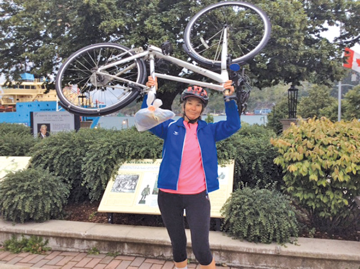On Saturday, September 10th Bunkey Cunliffe finished her Cross Canada Bike Ride in St John’s, Newfoundland after peddling 903km across Newfoundland since September 1st, and a total of 6,954km from Vancouver over the last 6 years. She couldn’t take her bike all the way to the water in St John’s so she anointed her front wheel on Water Street with a bit of the North Atlantic out of a Tim Horton’s cup. After all that way she still had enough energy left to lift her bike over her head in the traditional way following a major cycling event.