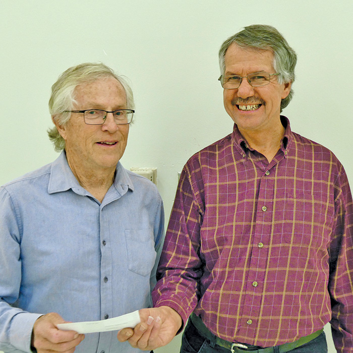 John Newitt from the Men’s Breakfast (right) presenting a cheque to Rob Davis of the Tobermory Health Services Auxiliary (left).