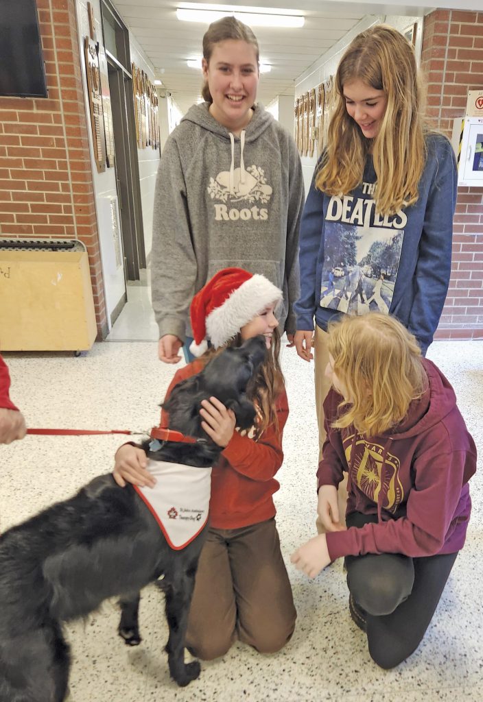 The dogs have been trained through a program provided by St. John’s Ambulance and have been certified to work with secondary-aged students. Daisy is also ‘qualified’ to work with younger students, though Lola still has more training to do to reach that stage. Therapy dogs are one of the strategies that we have incorporated at the school to help students who are struggling with stress and anxiety; it’s been shown that spending time with an animal is one way to lower blood pressure and manage other symptoms of stress. Lola will be back at the school just before exams, and she and some other dogs will also be present for an upcoming immunization clinic at the school. We’re happy to have them help us get through some of the difficult challenges that come with being in high school!