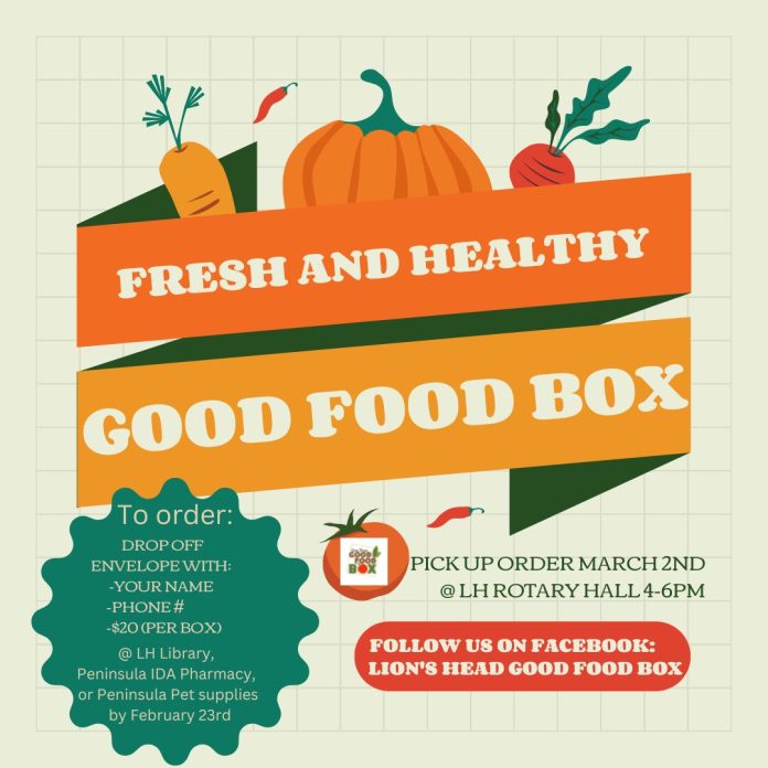 The GFB is a not-for-profit and sustainable food program that recognizes the importance of healthy eating and aspires to ensure access to fresh produce for all people in Grey and Bruce counties. Anyone can buy a box of fresh fruits and vegetables for $20.