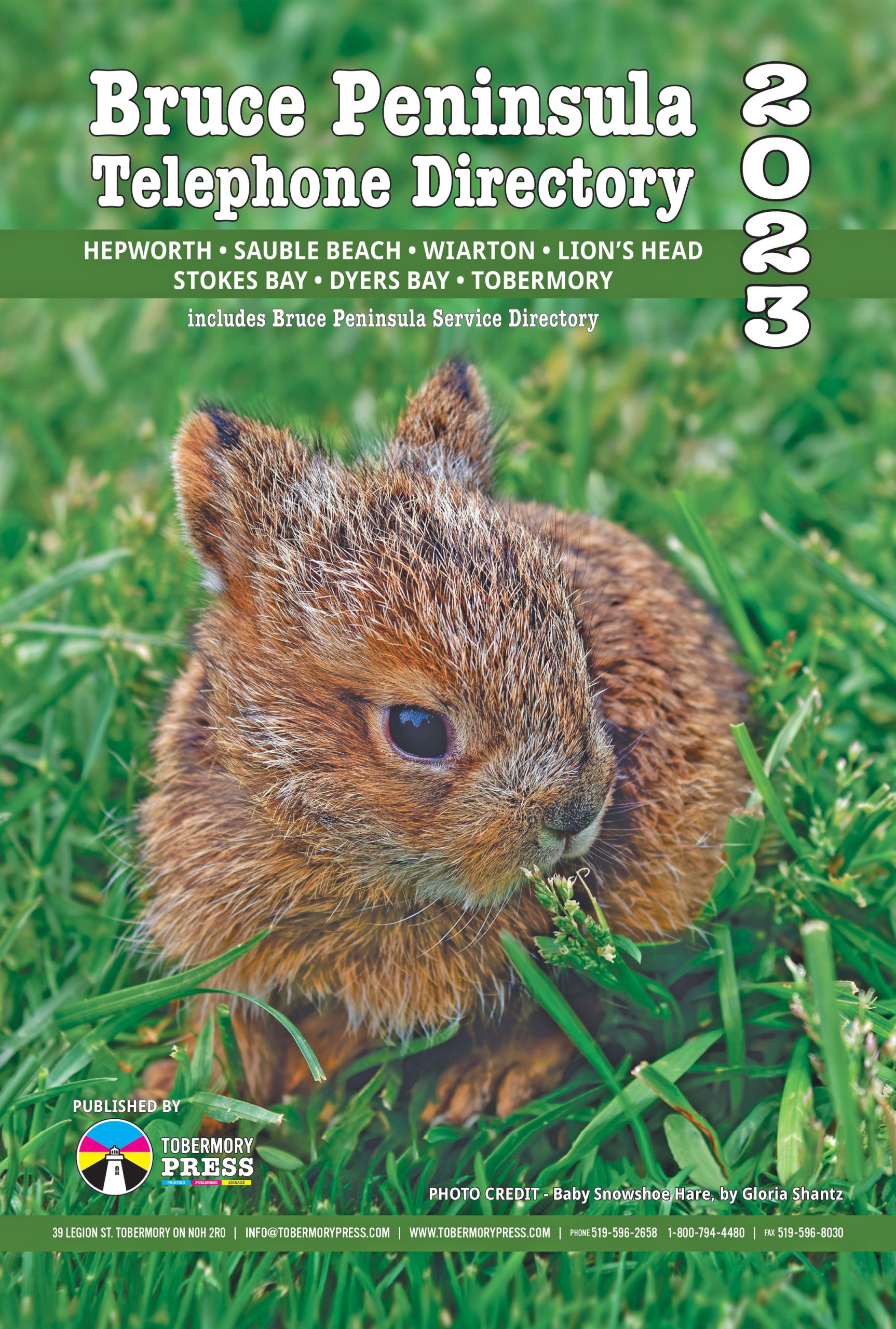 Congratulations to Gloria Shantz of Miller Lake, winner of the 2023 Bruce Peninsula Telephone Directory Cover Photo Contest. Their photo of a Baby Snowshoe Hare was chosen as the best of many local photos submitted this year.