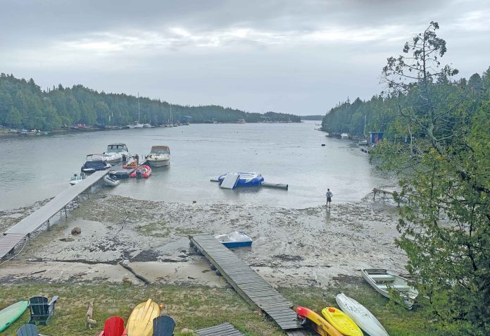 Photo: A series of seiches occurred around the Bruce Peninsula on Wednesday, August 23rd, with water levels dropping well below normal and then surging well above normal. The above photo was taken around 10:00AM at Big Tub Harbour in Tobermory, when the water was at its lowest. According to Tom Brown, who took the photo, water levels changed by approximately 3-4 feet.