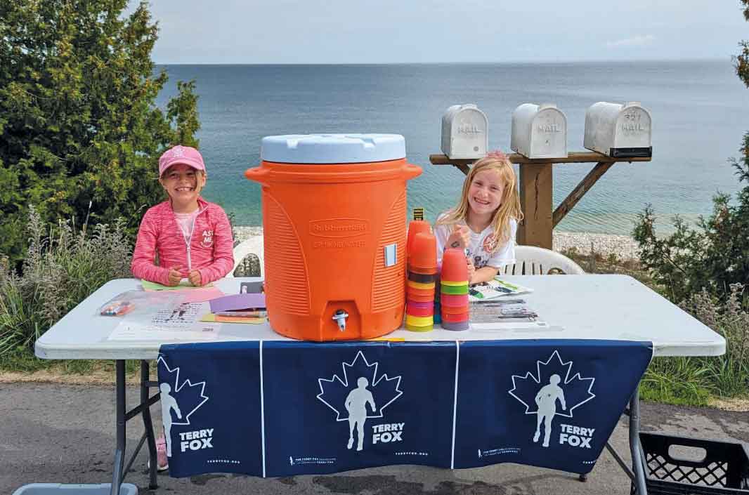 Photo L-R: Volunteers Izzy Tackaberry and Ella Martens man the water station on the Lion’s Head Terry Fox Run. Participants could choose to do any portion of the10 km route from BPDS to Isthmus Bay. Water stations were located at 2.5 km and 5 km.