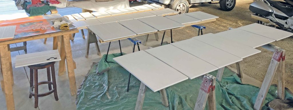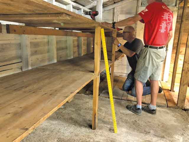 Shed members were also working in the storage shed at the Pike Bay Community Centre. The remains of a horse stall and two indoor outhouses for the former school were removed. The space was cleaned out, repairs made, and the walls painted white. A number of heavy duty tables made of wood planks were converted into shelves for the storage of items donated to the Centre for the auctions they hold.
