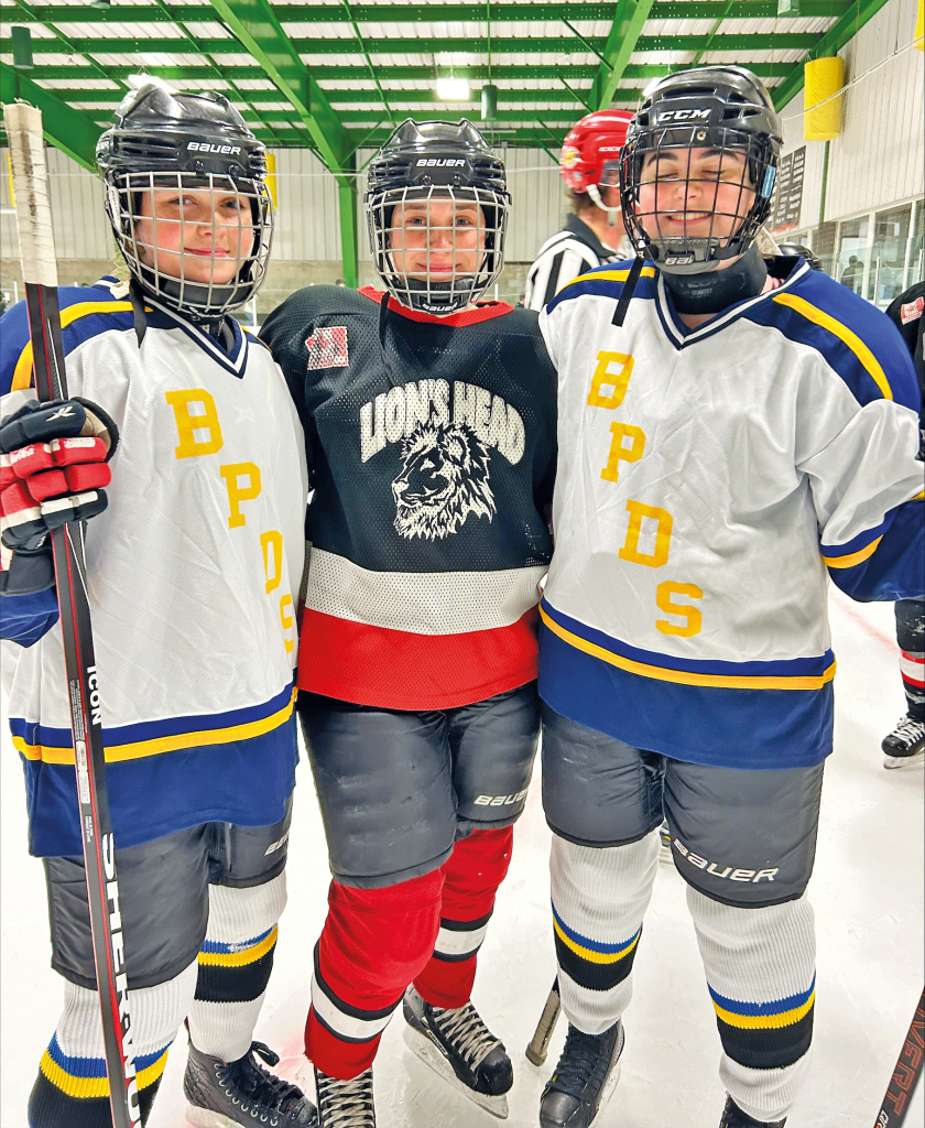 The game was a lot of fun – the final score 5-5 – and it was great to see the community come together to support the girls. Many former BPDS students played for the alumni team, as well as a few current staff.  A big shout out to Mary Hewton and her staff at the Booth for helping support the girls by selling pizza and slushies and donating proceeds to the team. We would also like to thank Milt McLay and the Municipality of Northern Bruce Peninsula for hosting us for the afternoon, as well as Blake Hellyer and James Wheeler for refereeing. Finally, thank you to Scott’s Home Hardware, The Dandelion, The Owen Sound Attack, and 8×8 Apparel for donating prizes and pucks used for the intermission activities.