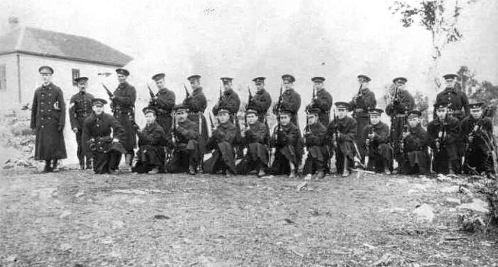 In 1914 15 soldiers of the 32nd Bruce Regiment (before 1900, the 32nd Bruce Battalion of Infantry, founded in 1866) were posted to Tobermory. They camped at North Point, known locally as Wireless Point, beside the Tobermory station. The men were experienced soldiers, but were soon replaced with untrained recruits and local men, possibly when the Army realized that the threat of German invasion was not as great as imagined.