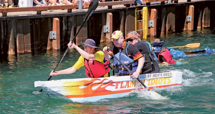Photo: Multi-year racer Geoff at the helm of new vessel “Just Ducky” (at the back) competes against the original “Papier Mushy” (leading the pack), which was built by Geoff and raced for its eighth time.