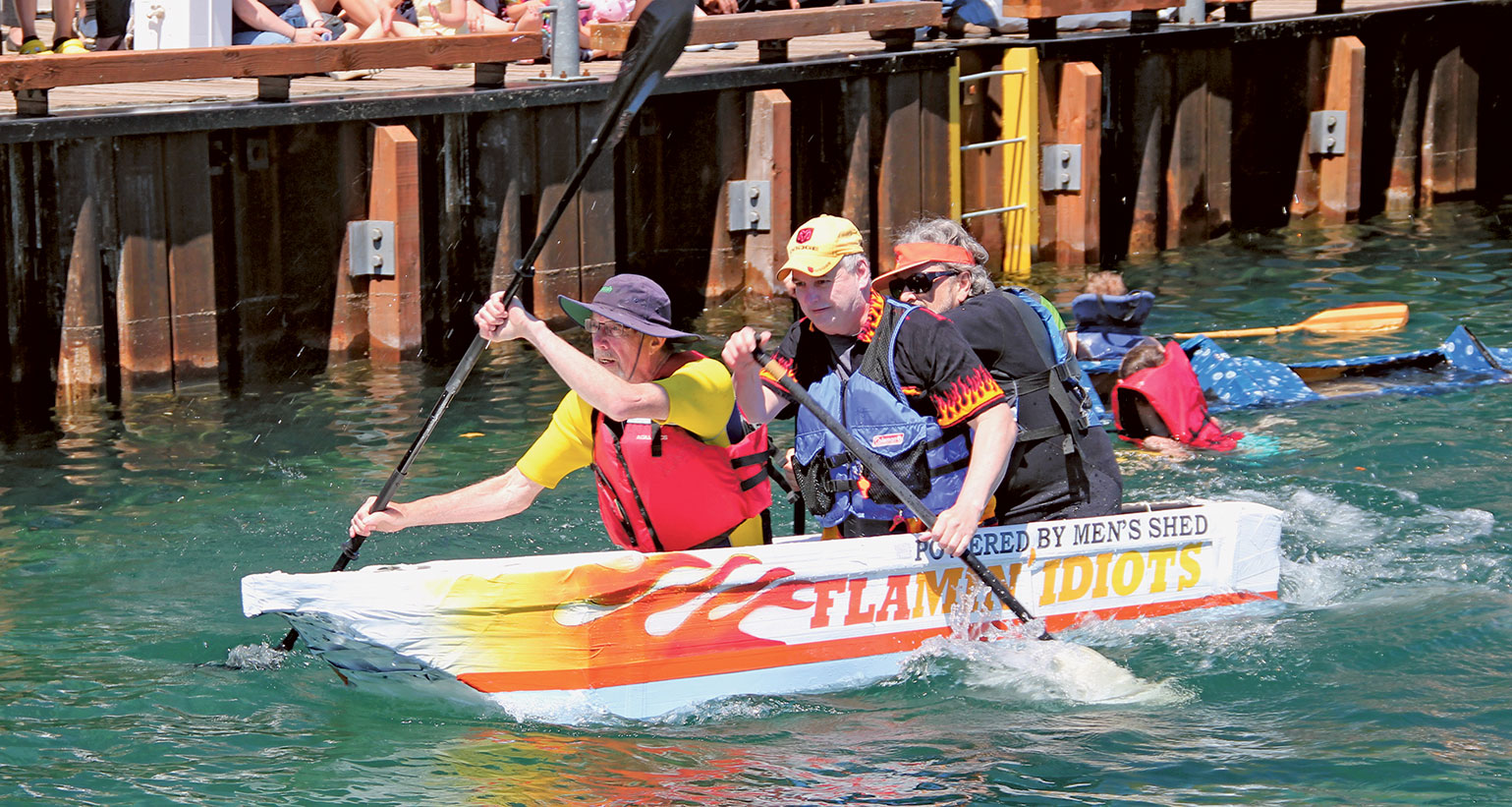 In order to give the boat some colour, artist Terry added flames, lettering and a blower for the boat’s “motor”. Unfortunately the blower was so powerful it blew itself off in the first few paddle strokes leaving it to the paddlers. It was an exciting race and we finished a fraction of a length behind the winners. We reviewed videos of the races at coffee this past Monday. Great fun again.