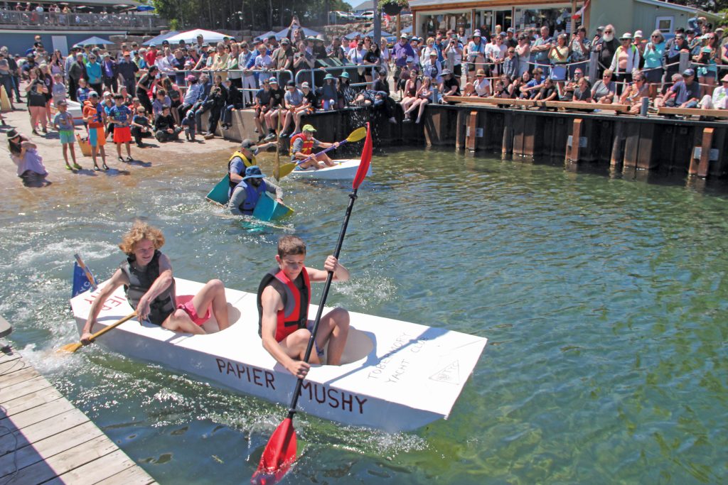 Various members gathered cardboard and they met at Harry’s shop (aka The Skunkworks) near Ferndale to review their bounty. Leading this group was multi-year racer Geoff, who had three boats in this year’s races. The original “Papier Mushy” raced for its eighth and as it turned out, final time. It ran two heats on Saturday, and unfortunately water ingress meant it crumpled when we tried to pick it up after the second heat. It folded like tissue paper and has become a fond memory. The second boat Geoff paddled on his own, this one was called “Just Ducky”, a rather tiny boat that successfully finished a heat but did not win.
