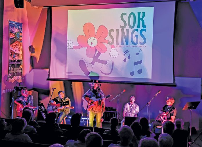 Everyone is familiar with the Sources of Knowledge (SoK) annual Forum as well as our periodic talks (“SoK Talks”) but now we have “SoK Sings!”. Our inaugural SoK Sings! event was held in front of a very enthusiastic audience at the Parks Canada Visitor Centre on the evening of June 6th. Directed by Marty Oblak and organized by John Newitt, it was a great success. The evening featured 5 musicians/songwriters in the main theatre performing two sets and 4 in the upper entrance hall before, after and during the intermission.