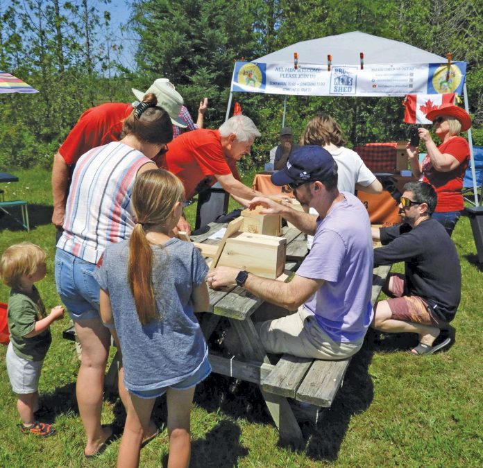 Monday July 1st at the Pike Bay second annual Canada Day Festival our group had our first ever booth set up to showcase the Bruce Men’s Shed. We had great member support in spreading the word about our group. People recognized us from Facebook and newspaper articles and came up to say hello. Others were curious about what a Men’s Shed is. We were able to show them the most recent project; the birdhouse kits we made and brought to the festival. A picnic table was set up so that anyone who wanted to assemble a birdhouse to take home was able to hammer them together. Our guys along with the kids’ parents helped assemble more than twenty.