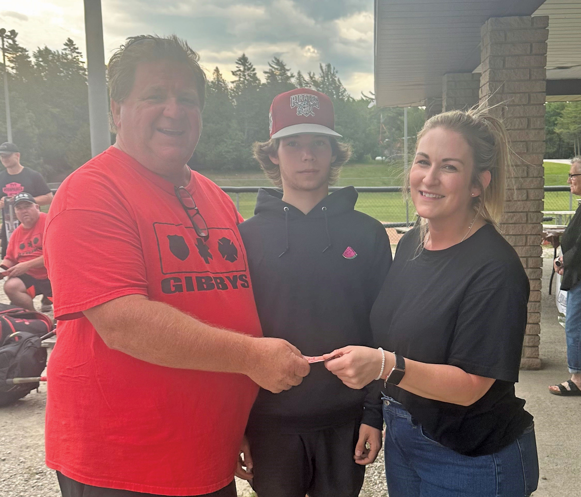 Photo: Kirk Gibbons (left) from winning team Gibby’s (Ultra Division) presents a donation to Tobermory Primary Place volunteer Katie Oblak (right).