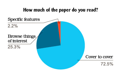 • 98.9% of respondents are regular readers. 72.5% read the paper cover to cover, while 25.3% browse things of interest.