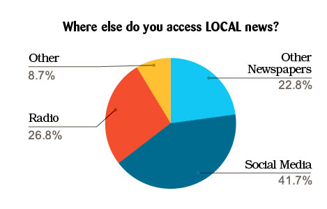 • When asked where else they access local news, 41.7% of respondents replied Social Media, 26.8% Radio, 22.8% Other newspapers, and 8.7% replied other. (Other responses included: online news sources, word of mouth, and local TV stations).