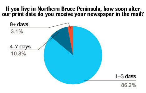 The Bruce Peninsula Press has an average circulation of 3,600 newspapers per issue. Approximately 2,800 of those are mailed free to residents of the Municipality of Northern Bruce Peninsula (MNBP), 350 are paid postal subscriptions, and 450 are sold in local stores. There were 90 surveys completed; a 2.5% response rate. The survey results are illustrated below.