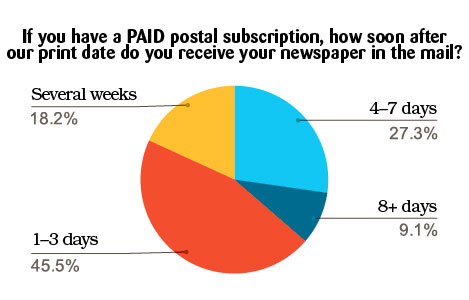 Survey respondents were asked to rate regular features from 1 (not important) to 5 (very important). Six features were rated as 4 or 5 by at least 60 of the respondents — the Calendar of Events, Publisher’s Column, OPP News, Letters to the Editor, community group reports and Reporter’s Notebook.