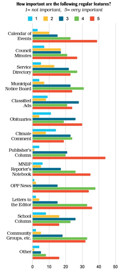 “Other” regular features that were marked as very important included: Real Estate ads, In the Garden column, New Businesses, Events Calendar, Weather and gardeners articles, History of the Bruce, Current events and world news, Local news stories that showcase the community and make you feel good.