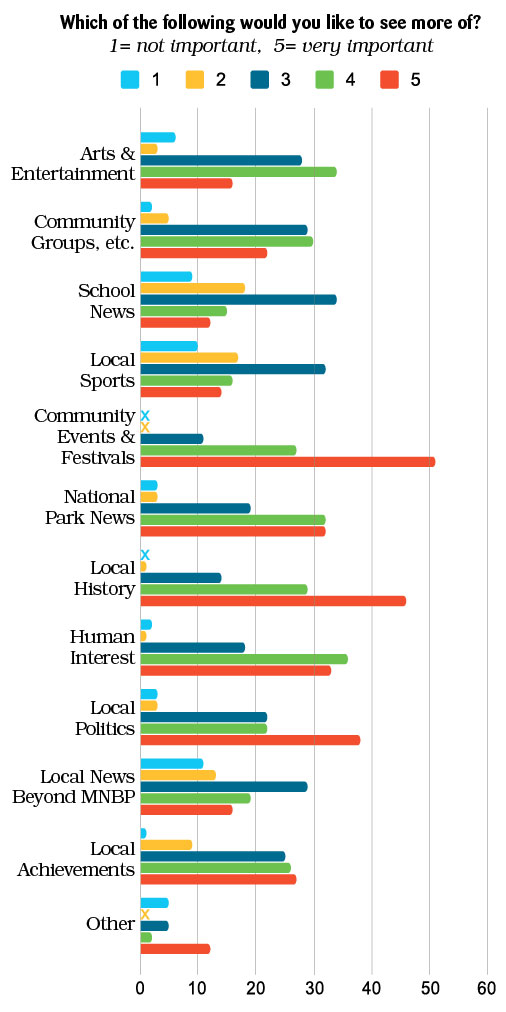 Repondents were also asked what they would like to see more of. The clear priority here was “Community events and festivals”. Other clear priorities were local history, human interest, local politics and the National Parks.