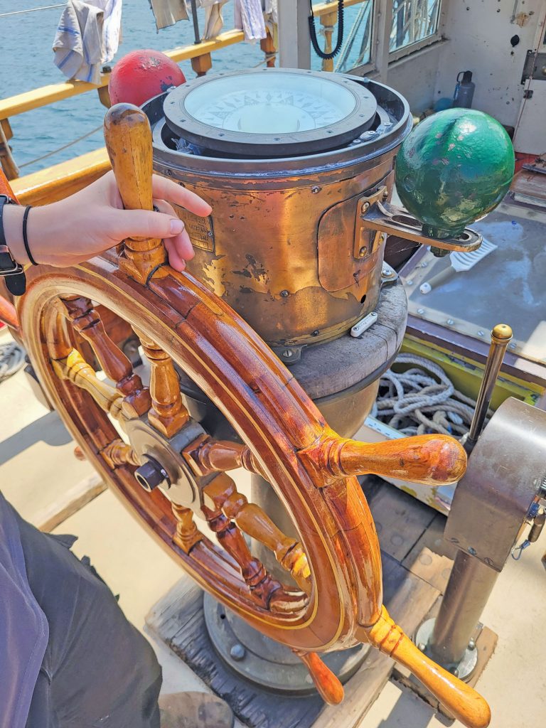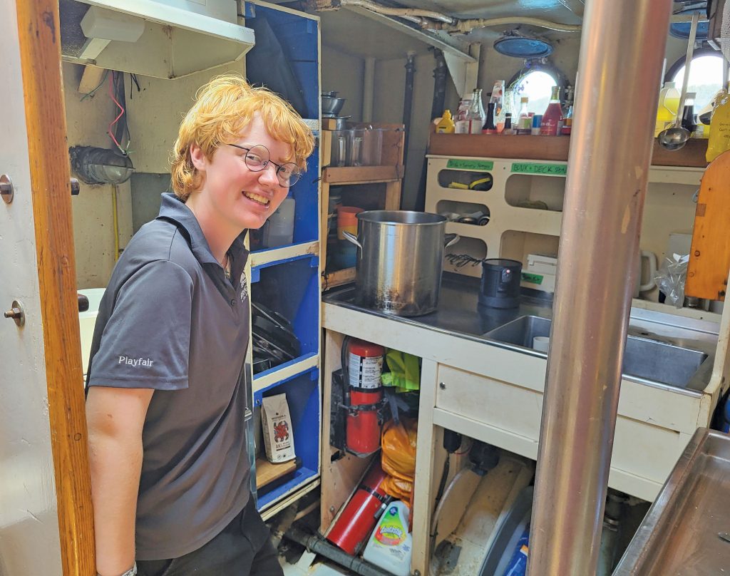 First Mate, Emma Boldon, was kind enough to show me around including a tour “below deck” while Captain Christine Chesterton was overseeing the departure of some of the crew. With a permanent crew of 12, and up to 18 trainees on board at any given time, the below deck sleeping quarters and galley are certainly crowded!
