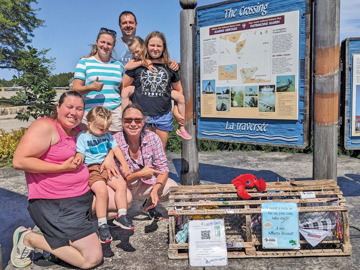 The Cross Canada journey of Lucky the Lobster made a quick stop in Tobermory on August 6th. The Lobster Quest East to West initiative, started by Karen and Chris McCallum, follows Lucky the stuffed Lobster, who relies on the kindness of strangers to hitch a ride from its start this spring in Charlottetown, P.E.I. across the County and back home to the McCallums in Alberta.