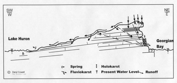 This process is called ‘karst’ which is a term taken from a region in Slovenia (“Kar(r)a”) where there is absolutely no surface water and every rain drop immediately passes downward into the limestone bedrock. Once inside the rock, water drains downward toward a ‘base level’ such as a river, lake or the ocean. On the Bruce Peninsula the lowest base level is Georgian Bay and Lake Huron. At some point in this journey groundwater reappears as springs.