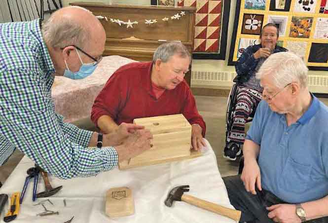 Last month four Men’s Shed members brought birdhouse kits to Golden Dawn and set up in the auditorium where we helped a number of male residents hammer birdhouses together. Earlier this year, using grant money, we purchased almost $500 of cedar boards to cut and keep in kit form. Twenty-seven of these kits were assembled by kids at the Pike Bay Canada Day event this summer, and seven more by the seniors.