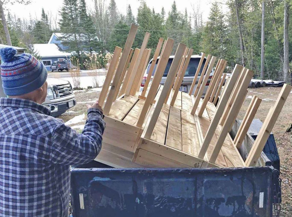 In addition to the first 12 that are built and assembled, many more are already cut and ready to assemble. One might think, how on earth will that fit into my car? The answer is that these are assembled with screws, and the legs come off for transport. For those interested in buying now and picking up in May we can do that. Anyone wanting them sooner can also be accommodated. Cash and e-transfer.