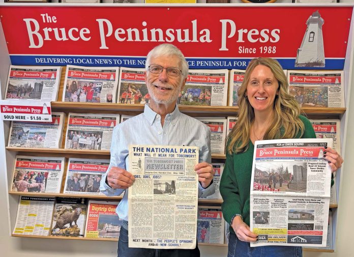 After more than 35 years as Publisher of the Bruce Peninsula Press, John Francis is stepping aside, handing over the reins to Bruce Peninsula Press editor and co-owner Marianne Wood.