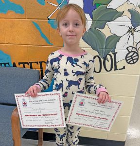 See the list of winners with first name and last name initial. The contest was held on November 15th and recently judged. The prizes were presented at the school Wednesday December 11, 2024. The prizes are made possible through the Community Poppy Campaign donations. Congratulations to the following students: