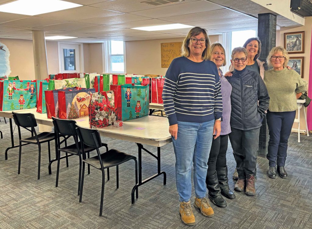 Food Bank volunteers Carolyn, Cathy, Theresa, and Tracy packed turkey and ham hampers for approximately 56 families in our community.